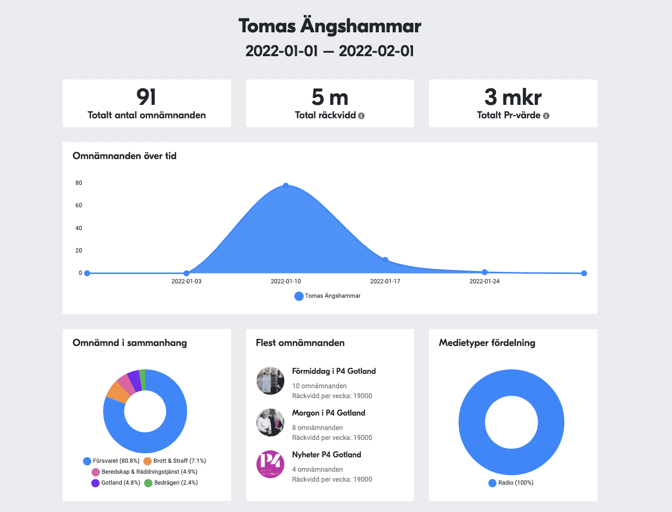 All Ears mätning visar att Tomas omnämnts 91 gånger under mätperioden (1/1- 1/2- 2022). Alla omnämnanden har gjorts i radio, men trots den smala mediefördelningen har han lyckats uppnå en räckvidd på fem miljoner, och ett PR-värde på 3 miljoner kronor.