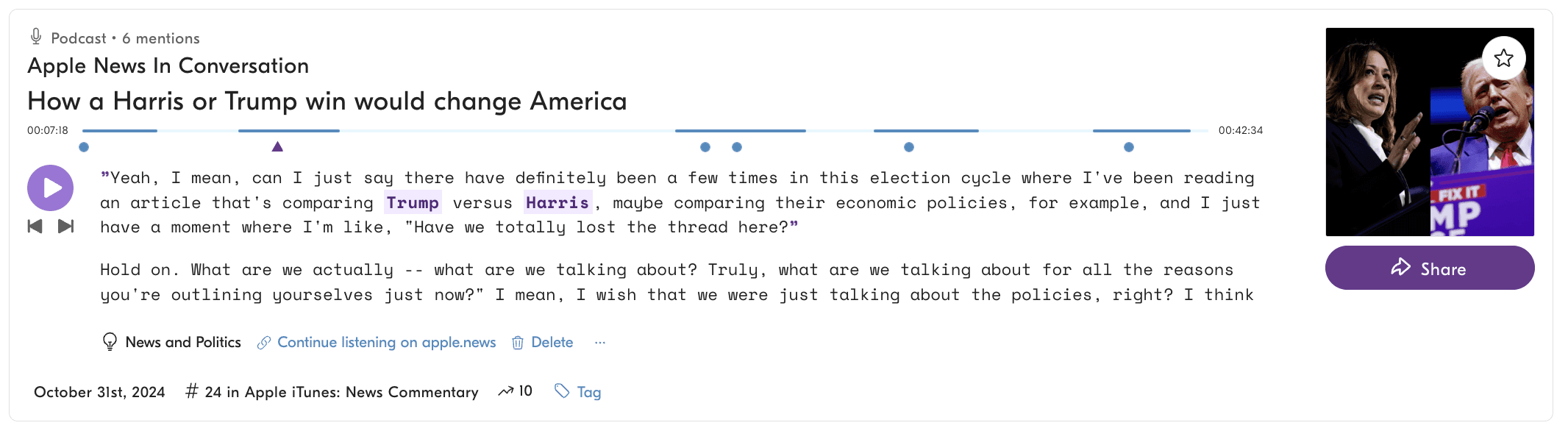 Med bara dagar kvar till valet reflekterar dessa podd diskussioner en djupt polariserad debatt kring kandidaterna. Trots den övervägande negativa tonen ger de positiva omnämnandena insikt i vad som kan vara de mest tilltalande aspekterna av Trump och Harris för deras respektive stöd. Denna analys visar hur poddar och andra sociala mediekanaler inte bara speglar utan också påverkar den offentliga uppfattningen inför det kommande valet.