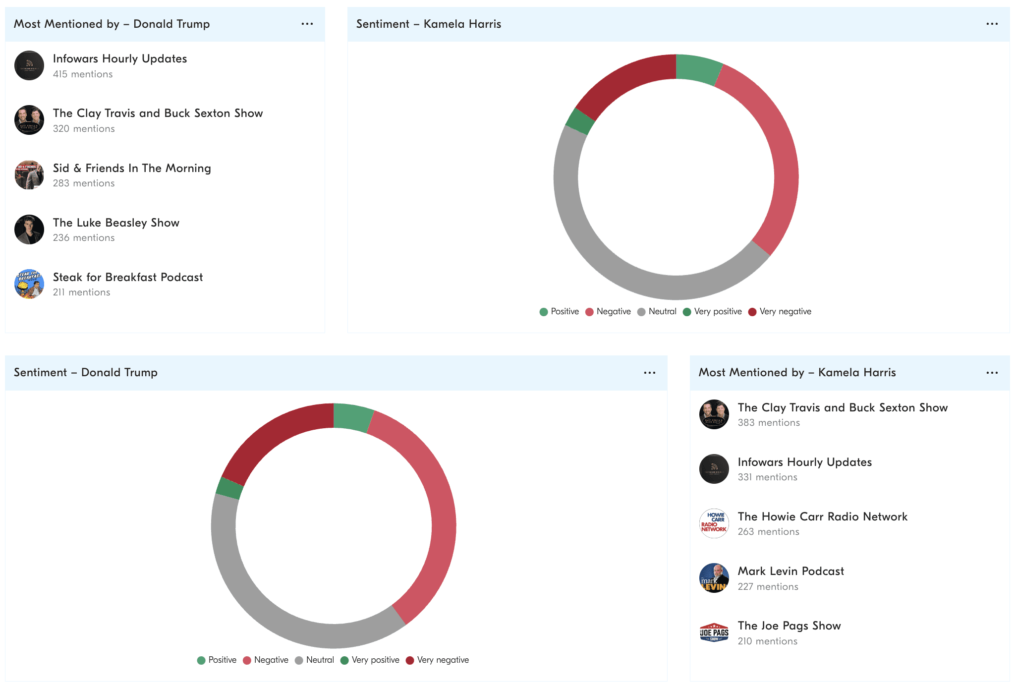 Vår analys visar att Trump omnämndes över 22 000 gånger, medan Harris omnämndes nästan 27 000 gånger i amerikanska poddar under den senaste veckan. Det som sticker ut är dock inte antalet omnämnanden utan deras ton: en betydande majoritet av omnämnandena för båda kandidaterna är negativa. Faktum är att mindre än 3 % av omnämnandena är mycket positiva för någon av kandidaterna, vilket indikerar en allmän skepticism mot deras kampanjer och budskap.