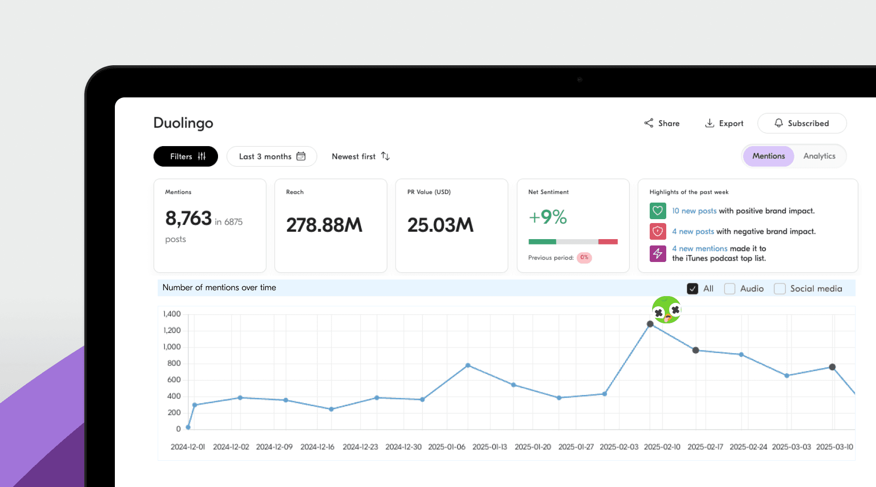 Duolingo har blivit ett skolboksexempel på hur man kan använda social listening för att skapa viralt innehåll och forma en smart marknadsstrategi. Varumärket uppmärksammade att användare på TikTok skämtade om deras uggle-maskot, ”Duo”, och hur påträngande appens pushnotiser var. Istället för att ignorera eller försvara sig, valde Duolingos team att omfamna skämten och skapa självironiskt, roligt innehåll som låg helt i linje med målgruppens ton. Denna reaktiva och lekfulla strategi resulterade i miljontals likes, ökade nedladdningar och en stark top-of-mind-positionering.
