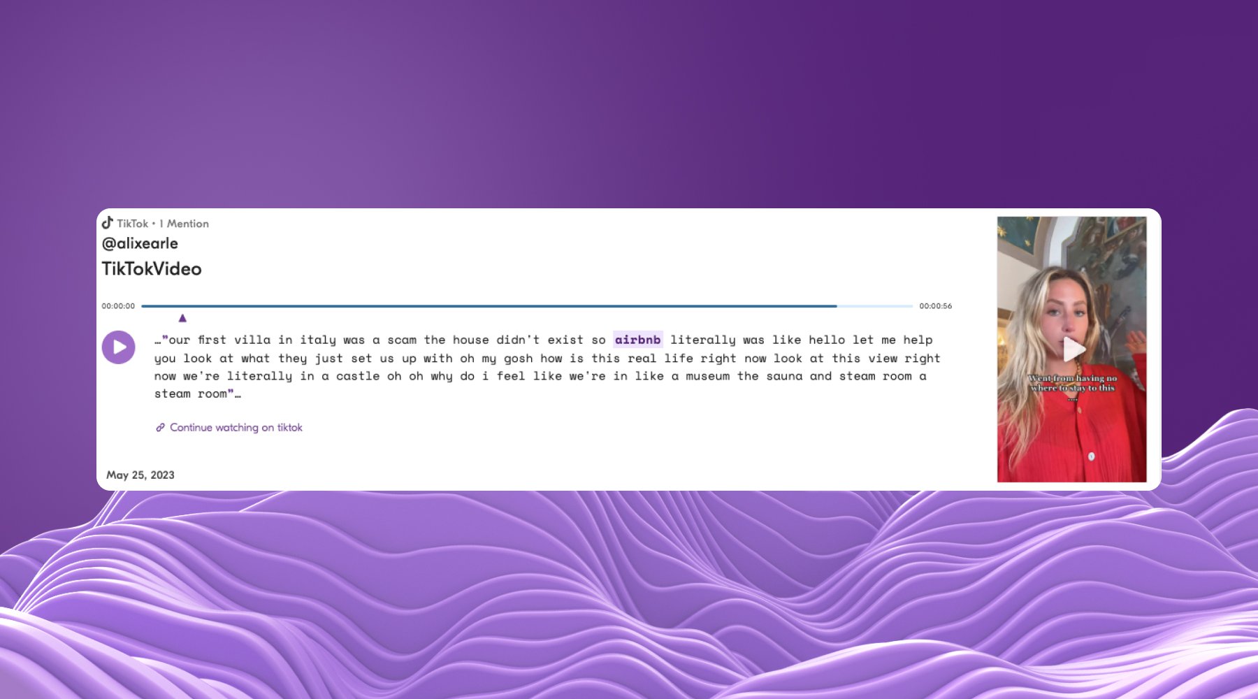 När TikTok profilen Alix Earle, (7+ miljoner följare) delade att hon blivit strandsatt utan boende i Italien, fångade Airbnbs marknadsteam upp klippet. Inom några timmar hade de ordnat en lyxvilla åt henne och hennes vänner. Resultatet? Enorm organisk synlighet, positiva reaktioner och bred mediebevakning – allt tack vare snabb, smart social listening.