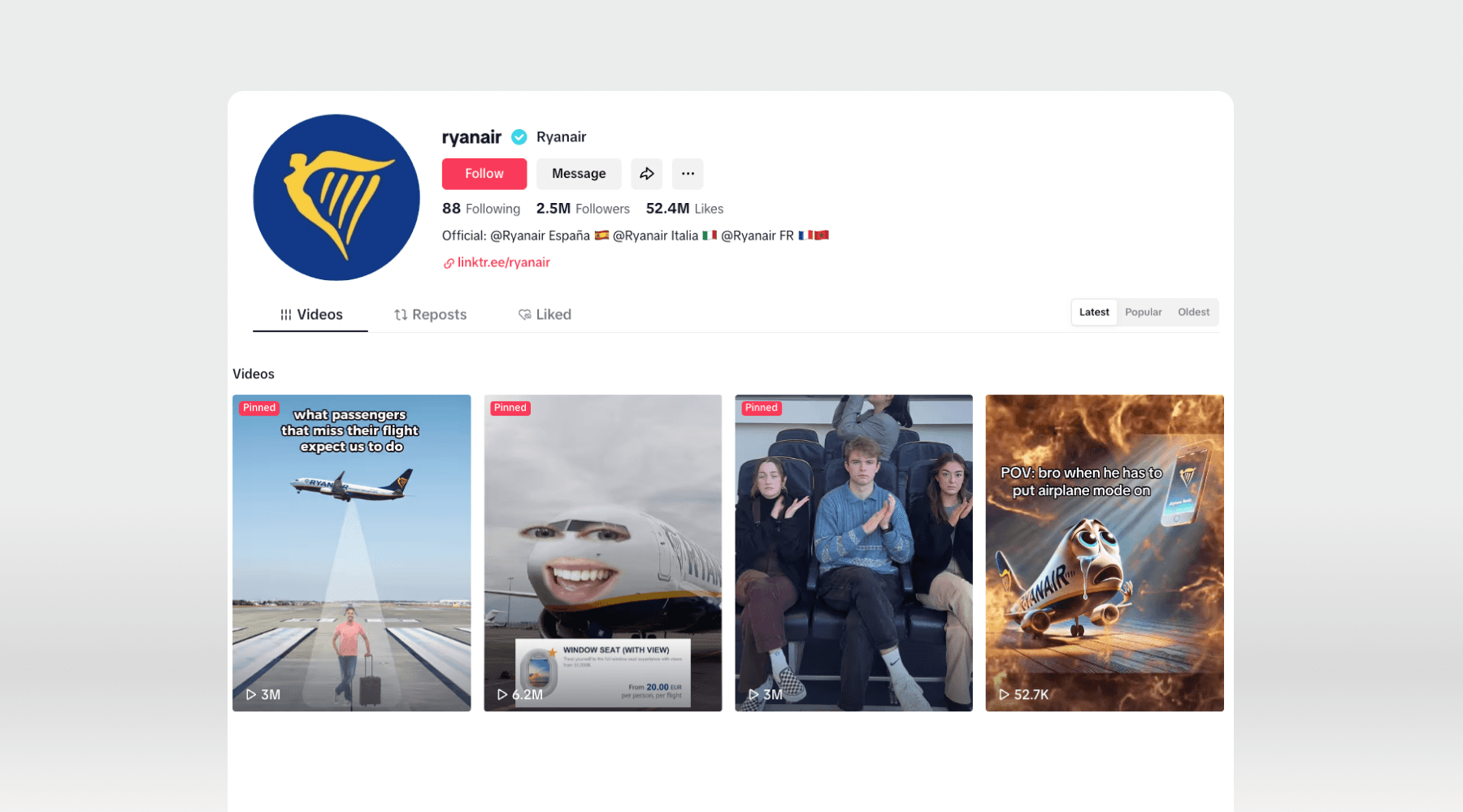 Ryanair har fullt ut omfamnat sitt rykte som ett “love it or hate it”-flygbolag genom att spela med i meme-kulturen kring varumärket. Genom att lyssna på hur Gen Z pratar om Ryanair online – ofta via sarkastiska tweets och TikTok-skämt – svarar flygbolaget med humor och självdistans. Deras TikTok konto använder trendigt ljud, memes och reaktivt innehåll för att förvandla kritik till engagemang. Istället för att backa undan från negativt sentiment, använder de det som bränsle för igenkänning och för att skapa kontakt med en yngre målgrupp.